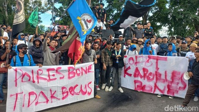 Sejumlah mahasiswa dan pemuda menggelar demonstrasi di Mapolres Bone, Sulawesi Selatan (Sulsel). Mereka mendesak agar Kasat Narkoba Polres Bone AKP Aswar dicopot dari jabatannya usai diduga meminta uang damai Rp 70 juta ke pelaku narkoba.