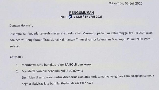 Pengobatan itu berlangsung di Kantor Kelurahan Masumpu, Kecamatan Tanete Riattang, Kabupaten Bone, pada Rabu (9/7) mulai pukul 09.00 Wita. Pemerintah Kelurahan Masumpu juga menerbitkan surat nomor: 51/KMS/TR/VII 2025 soal pengumuman pengobatan tradisional Kalimantan Timur.