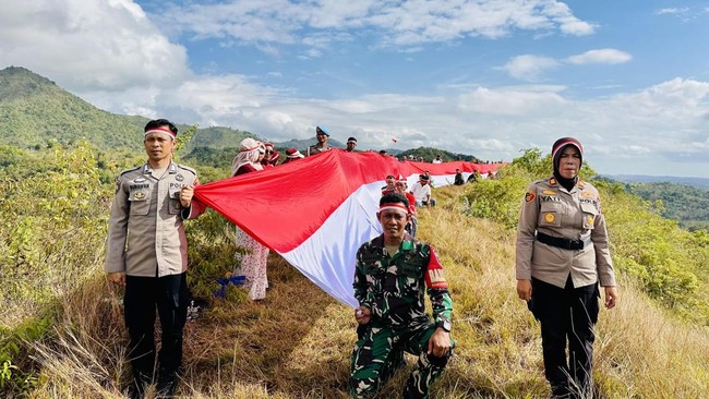 Polisi bersama TNI dan masyarakat Kecamatan Lamuru, Kabupaten Bone, Sulawesi Selatan (Sulsel) mengibarkan bendera merah putih sepanjang 80 meter di atas gunung menjelang HUT ke-80 RI. Kegiatan ini untuk merayakan kemerdekaan bersama warga yang tinggal di pegunungan.