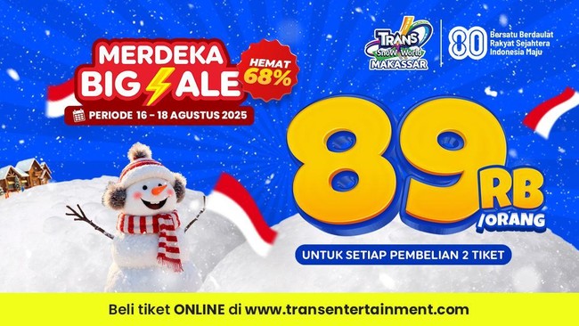 Selama periode 16-18 Agustus 2025, kamu bisa membeli tiket Trans Snow World Makassar dengan harga hanya Rp 89.000 per orang untuk setiap pembelian minimal 2 tiket. Promo ini hanya berlaku tiga hari, jadi pastikan kamu tidak melewatkannya.