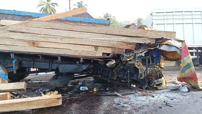 "Truk kayu ini di jalan yang sedikit menanjak itu diduga karena mengantuk mengambil jalur kanan, dan dari arah Palembang ada trailer tersebut sehingga terjadi tabrakan adu kambing antara keduanya," beber Indro.
