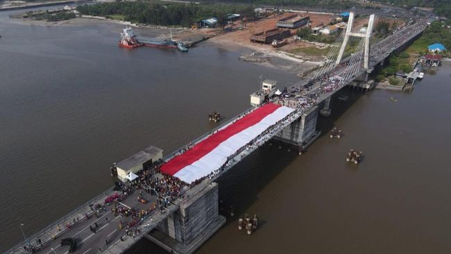 Bendera raksasa itu memiliki panjang 78 meter dan lebar 23 meter. Lokasinya di Jembatan Emas, Kota Pangkalpinang, Bangka yang merupakan ikon pariwisata.