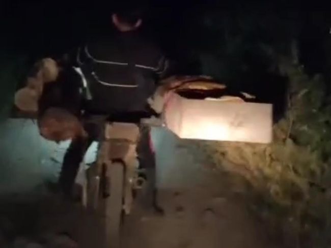 Jenazah diangkut dengan sepeda motor di belakang. Sementara pada bagian sebelah kanan diimbangi dengan batang pisang agar motor seimbang.