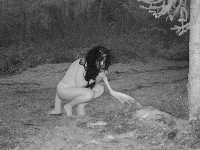 "Saya dan kakek memasang kamera untuk melihat apakah ada hewan lain dan sempat ada kucing bobcat," katanya. Setelah diperiksa lagi, ada rekaman dua orang wanita setengah telanjang mendekati bangkai itu dan terlihat memakannya.