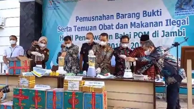 "Jadi sejak tahun 2019 sampai 2022 barang-barang ilegal dan obat mengandung kimia ini kita temukan. Dan sekarang barang-barang ini kita musnahkan," kata Kepala BPOM Jambi, Alex Sander, Jumat (16/6/2023).