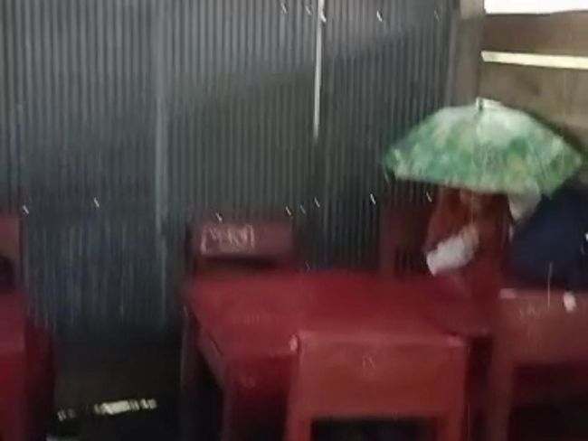 Heboh sebuah video memperlihatkan siswa SD yang menggunakan payung saat belajar dalam kelas. Kondisi itu ternyata karena atap sekolah bocor saat hujan.