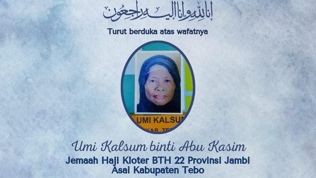 Seorang jemaah haji bernama Umi Kalsum binti Abu Kasim asal Dusun Pagar Puding, Kabupaten Tebo Ulu, Provinsi Jambi dilaporkan meninggal dunia di Tanah Suci Mekkah, Arab. Lansia berusia 60 tahun itu meninggal akibat sakit.