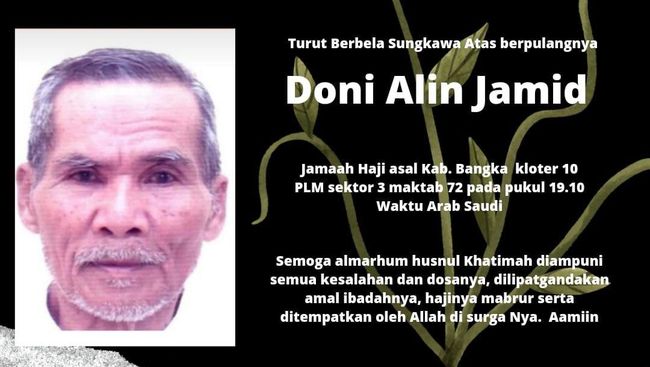 Jemaah haji yang meninggal kali ini bernama Doni Alin Jamid (77). Doni merupakan jemaah Kloter 10 yang diberangkatkan pada 6 Juni 2023 lalu.