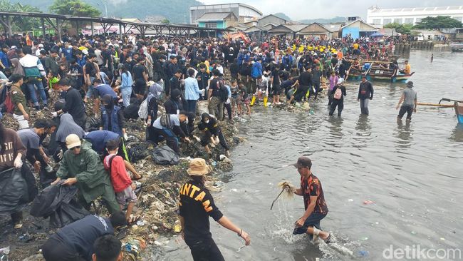 Pantauan detikSumbagsel, meski diguyur hujan deras, ribuan masyarakat tetap semangat memungut satu persatu sampah yang menumpuk di pantai paling kotor nomor dua se Indonesia ini.