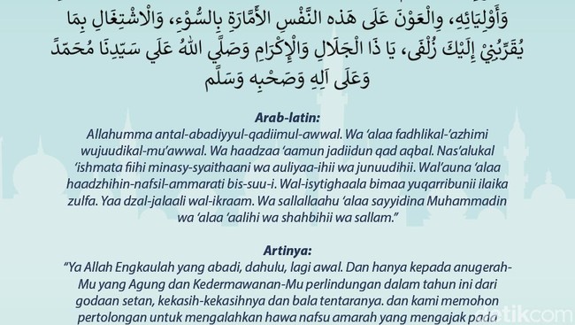 "Ya Allah, Engkaulah yang abadi, dahulu, lagi awal. Dan hanya kepada anugerahMu yang Agung dan kedermawananMu, perlindungan dalam tahun ini dari godaan setan, kekasih-kekasihnya dan bala tentaranya. Dan kami memohon pertolongan untuk mengalahkan hawa nafsu amarah yang mengajak pada kejahatan, agar kami sibuk melakukan amal yang dapat mendekatkan diri kami kepadaMu wahai Dzat yang memiliki keagungan dan kemuliaan.