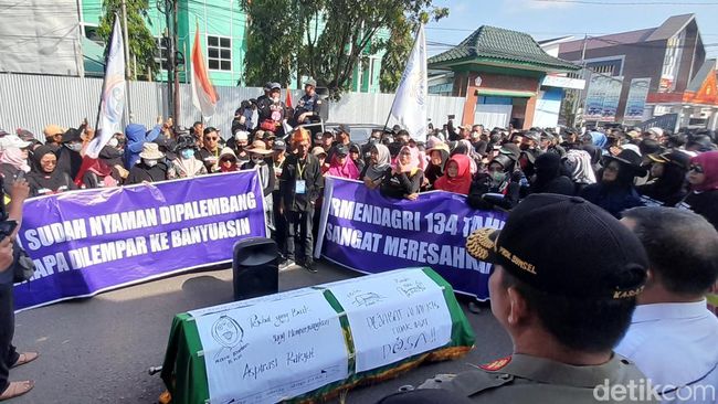 Ratusan warga yang tinggal di perbatasan Palembang-Banyuasin yang menggelar aksi di depan kantor Gubernur Sumatera Selatan. Mereka keukeuh tetap menjadi Palembang, menolak pindah ke Banyuasin.