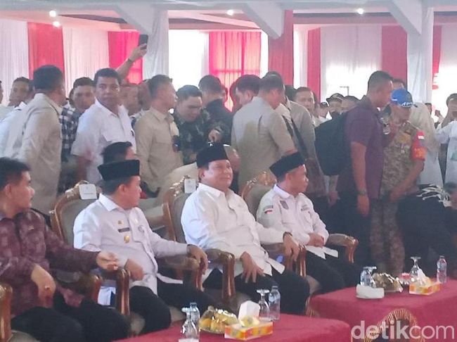 Pantauan detikSumbagsel di lokasi, Prabowo Subianto tiba sekitar pukul 11.30 WIB. Acara yang awalnya tenang tiba-tiba menjadi ramai karena para kepala desa yang hadir heboh menyambut kedatangan Prabowo.
