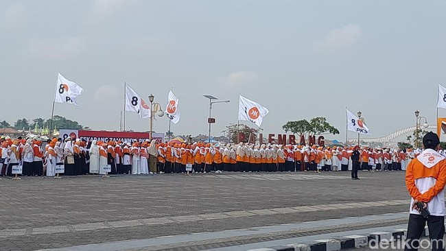 Ribuan kader Partai Keadilan Sejahtera (PKS) menghadiri apel siaga untuk pemenangan PKS dan calon presiden (capres) Anies Rasyid Baswedan. Kegiatan ini dilakukan di Pelataran Benteng Kuto Besak (BKB) Palembang, Minggu (13/8/2023).