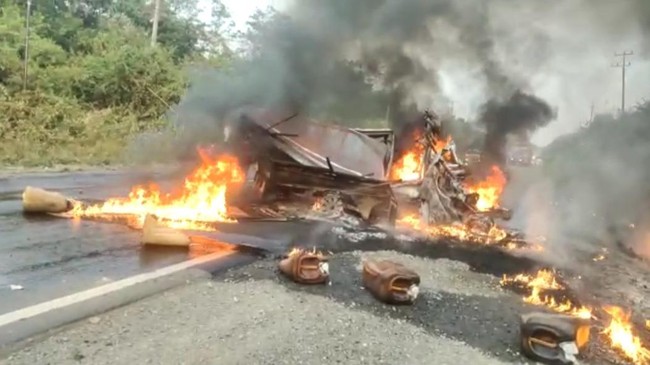 Mobil Grand Max bermuatan solar terbakar di Jalan Lintas Sumatera KM 32, Simpang Dusun Rantau, Kecamatan Tanah Sepenggal Lintas, Bungo, Kamis (14/9/2023) pagi. Sopir mobil itu tersebut tewas terbakar.