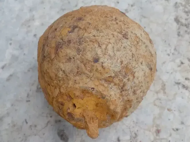 Granat itu tampak berbentuk bulat dan sudah menguning karena lama tertimbun tanah. Begini penampakannya.