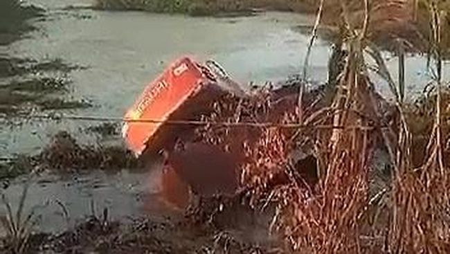 Satu unit ekskavator terperosok ke dalam embung saat proses pencarian korban tenggelam di Kecamatan Gedong Meneng, Kabupaten Tulang Bawang, Lampung. Beruntung operator ekskavator selamat meski sempat tak sadarkan diri.