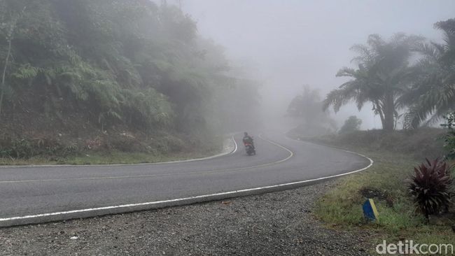 Pantauan detikSumbagsel, Senin (2/10/2023) pagi, kabut asap menyelimuti jalan Lintas Liku Sembilan Bengkulu-Kepahiang. Jarak pandang mulai terbatas.