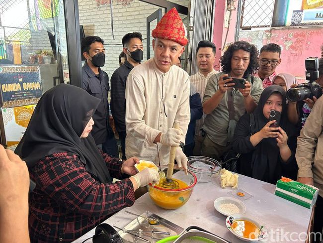 Saat datang, Ganjar langsung ikut membuat kue khas Palembang yakni maksuba. Ganjar dibantu owner Bunda Rayya, Yus Elisa memecahkan telur satu per satu ke mangkuk. Kemudian Ganjar pun mengocok telur tersebut.
