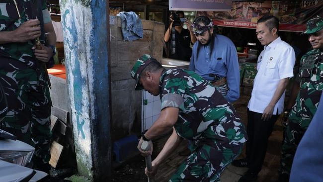 Panglima Kodam II Sriwijaya Mayjen TNI Yanuar Adil dan Penjabat Wali Kota Palembang Ratu Dewa melakukan pembersihan di Pasar Sekip Ujung Palembang, Kamis (7/12/2023). Aksi itu dilakukan untuk mencegah dan mengatasi banjir di Palembang.