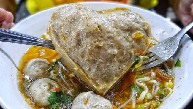 Ada juga menu bakso yang unik karena berbentuk love. Namanya bakso hati ambyar. Menu lainnya ada bakso Krakatau, Rinjani hitam, melted cheese, mozzarella, telur, urat judes, dan pentol kuah merah.