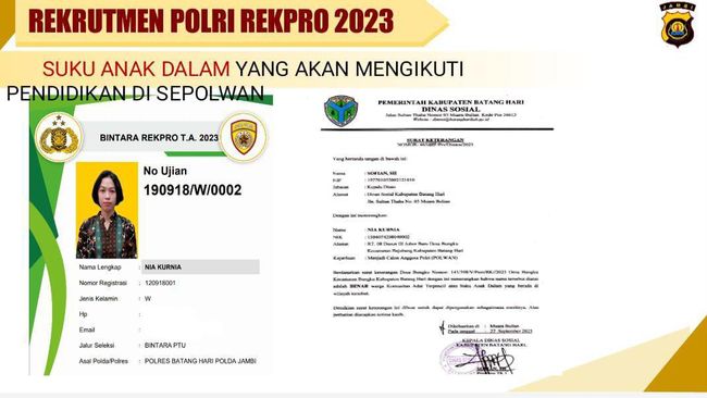Perwakilan Suku Anak Dalam (SAD) kembali bergabung di instansi kepolisian. Kali ini, yang lulus seleksi Bintara rekrutmen proaktif (Rekpro) tahun 2023 merupakan seorang wanita atau Polwan pertama dari SAD.