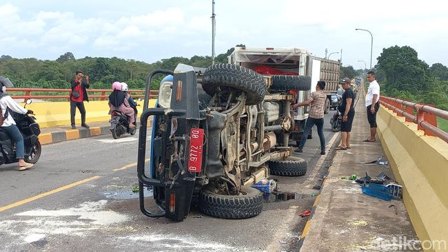 Mobil rescue Kementerian Sosial milik Dinas Sosial Provinsi Jambi yang tengah membawa paket sembako bantuan korban banjir terguling di Jembatan Auduri 2, Kota Jambi. Akibat kejadian itu, sopir dan penumpang yang ada di dalam mobil itu mengalami luka-luka.