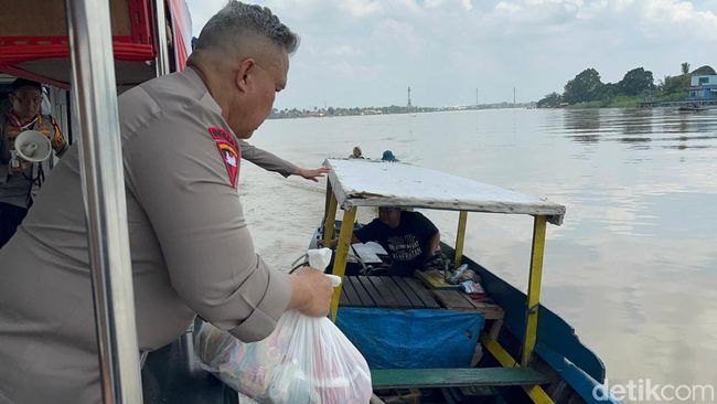 Kapolda Jambi Irjen Rusdi Hartono mengarungi lokasi banjir di bantaran Sungai Batanghari untuk memberikan bantuan paket sembako. Pembagian dilakukan dengan kapal Polairud.