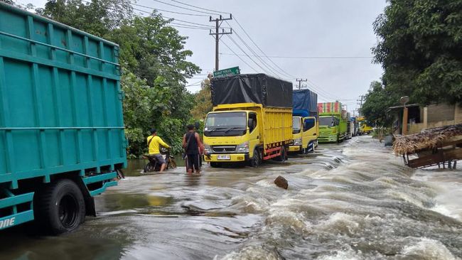 Selain karena banjir, jalan di wilayah itu juga berlubang, membuat pengendara tidak bisa melintas cepat. Bahkan, sejumlah kendaraan tidak bisa melaju karena ban mobil masuk ke lubang cukup besar. Beberapa truk yang kesulitan melintas pun harus ditarik oleh kendaraan besar lainnya.