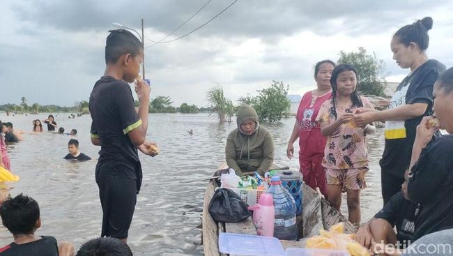 "Alhamdulillah Pak, di tengah banjir ini saya bisa berjualan makanan ringan, sosis dan minuman es untuk anak-anak yang sedang mandi," ungkap Erni, salah satu warga.