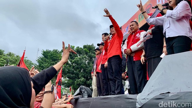 Meski sempat diguyur hujan, ribuan masyarakat Jambi dan para relawan banteng terlihat ramai memadati lapangan GOR Kota Baru Jambi. Mereka bersemangat dalam meraih kemenangan pada pemilu 14 Februari 2024 mendatang.