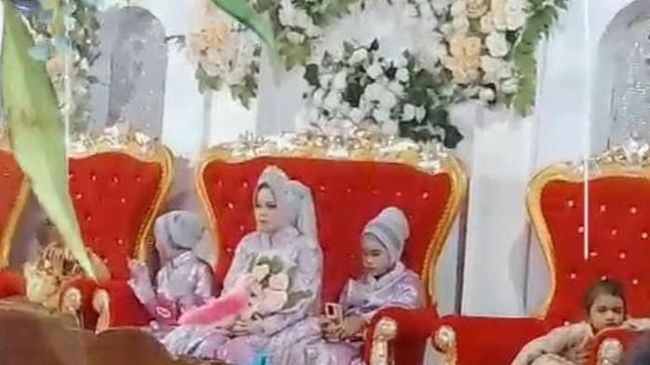 Sang mempelai yang duduk di atas pelaminan sendirian pun viral di media sosial. Dalam video beredar, terlihat pengantin wanita duduk bersama dua anak kecil saat acara resepsi. Tampak wanita tersebut mengenakan pakaian pernikahan lengkap berwarna ungu beserta peralatan.