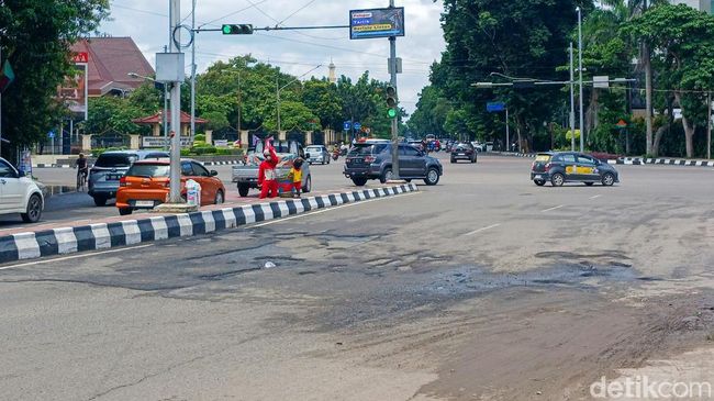 Pantauan detikSumbagsel terlihat lubang-lubang besar menganga di pangkal Jalan Radial. Tidak adanya penanda atau rambu-rambu peringatan kepada pengendara, hal ini berpotensi menimbulkan kecelakaan lalu lintas.