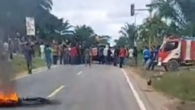 Ratusan masyarakat Karang Jaya memblokade akses Jalan Lintas Sumatera (Jalinsum) Sarolangun-Lubuklinggau di Kabupaten Musi Rawas Utara (Muratara), Sumsel. Hal itu dipicu karena permintaan penghitungan suara Pemilu 2024 di sejumlah TPS ditolak.