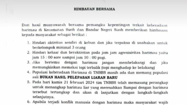 Dilihat detikSumbagsel, dalam surat edaran imbauan tersebut ditandatangani oleh Camat Bandar Negeri Suoh, Mandala Harto, Camat Suoh, Dapet Jakson, Kepala Balai Besar TNBBS, Sulki, Koramil Batu Brak, Suroto, Kapolsek BNS dan Suoh, Edward Panjaitan serta Kepala Wes WWE, Arif. Surat edaran itu berisi 7 point imbauan kepada masyarakat untuk mengantisipasi dan mencegah serangan harimau.