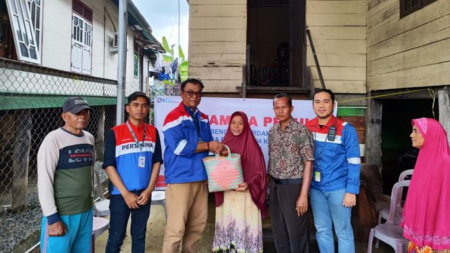PT Pertamina memberikan bantuan sembako kepada korban terdampak banjir di kawasan Kasang, Kota Jambi. Bantuan yang diberikan ini melalui program Pertamina Peduli.
