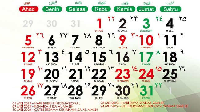 Awal bulan Mei 2024 dibuka dengan libur nasional pada 1 Mei. Selain itu, ada tanggal merah Kenaikan Yesus Kristus dan Hari Raya Waisak 2586 BE. Lengkapnya berikut jadwal tanggal merah di bulan Mei: