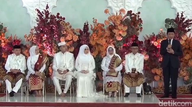 "Bismillahirrahmanirrahim Muhammad Iqbal bin Zainal Abu Bakar saya nikahkan engkau dengan anak kandungku Esy Risdianti dengan mahar 50 gram emas logam mulia dibayar tunai," kata Al Haris saat menggelar akad nikah anaknya itu.