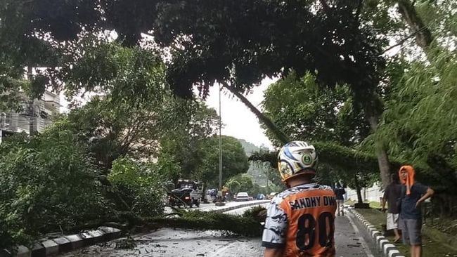 "Pohon ini tumbang diakibatkan hujan deras dan angin yang berhembus kencang sekira pukul 16.30 WIB, dan kami mulai menebangi dan membersihkan (pohon)," ujarnya.