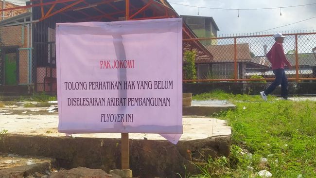 Kedatangan Presiden Joko Widodo ke Sumatera Selatan dimanfaatkan pemilik tanah, Siswadi yang lahannya belum dibebaskan dalam proyek Flyover Sekip Ujung Palembang, Sumatera Selatan dengan memasang spanduk pengumuman terkait ganti rugi.
