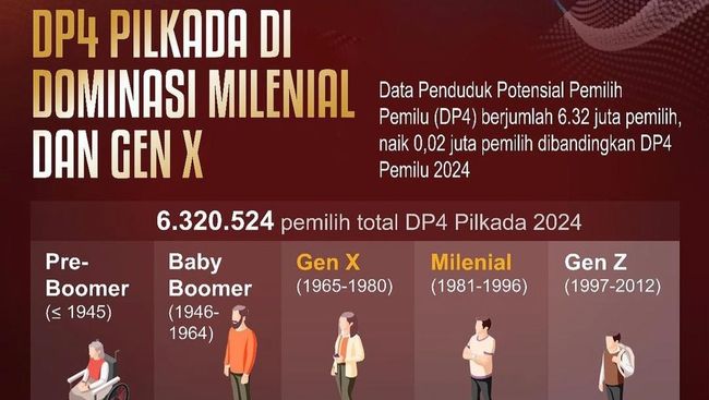 Dari angka DP4 tersebut, KPU menyebut generasi milenial (1981-1996) menjadi pemilih terbanyak untuk Pilkada serentak 27 November 2024. Persentasenya mencapai 35,33% atau sebanyak 2.232.849 pemilih.
