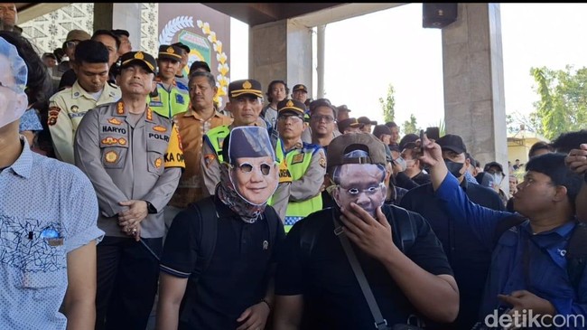 Pantauan detikSumbagsel, Kamis (22/8) beberapa mahasiswa maju ke depan dan berdiri membelakangi ketua komisi 5 DPRD Sumsel Susanto Adjis. Mereka menggunakan topeng wajah Prabowo Subianto, Bobby Nasution, hingga Bahlil Lahadalia.