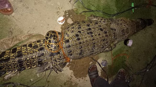 "Dibawa ke dusun dengan kondisi masih hidup. Sekarang buaya sudah ada di pemukiman belakang Pak Kades dan sudah berkoordinasi dengan Kecamatan dan BPBD terkait dengan buaya itu," ujarnya.