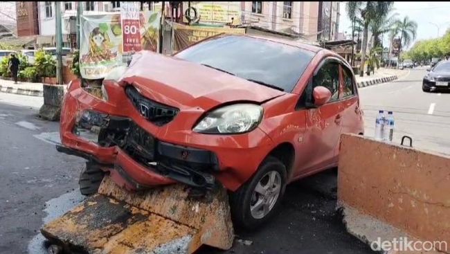 Mobil Honda Brio dengan nomor polisi (nopol) BG-1552-UA yang kendarai emak-emak menghantam pembatas jalan di Palembang, Sumatera Selatan. Beruntung, dalam kejadian itu, pengemudi dan anaknya selamat.