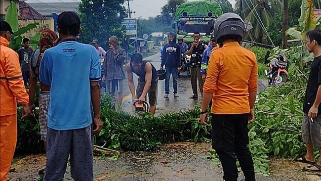 Hujan intensitas lebat disertai angin kencang menyebabkan pohon tumbang di wilayah Musi Banyuasin (Muba), Sumatera Selatan. Pohon yang tumbang menutup badan jalan, membuat arus lalu lintas tersendat.