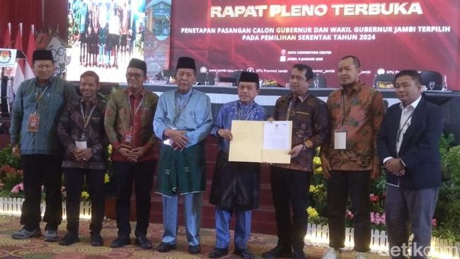 "Menetapkan pasangan calon nomor urut 2 Al Haris dan Abdullah Sani sebagai pemenang Pilkada menjadi Cagub dan Wagub Jambi terpilih pada Pilgub Jambi 2024," kata Ketua KPU Provinsi Jambi, Iron Sahroni, Kamis (9/1/2025).