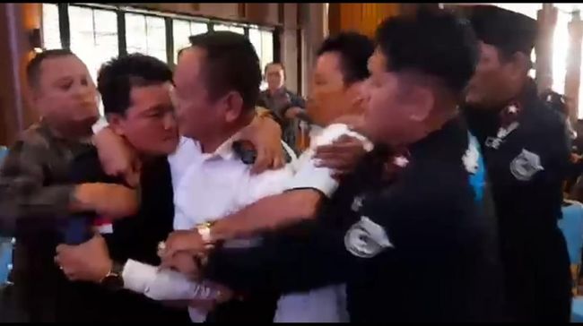 Dalam video beredar, tampak dua orang pria yang masing-masing mengenakan kemeja hitam dan kemeja putih dengan peci saling bergulat. Dengan segera, orang-orang di sekitar mereka berusaha melerai.