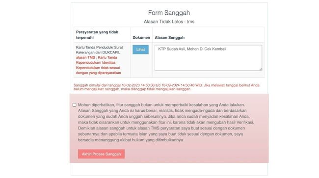 Misalnya, foto KTP yang diunggah TMS karena tidak sesuai dengan ketentuan. Pelamar bisa menyanggah hal tersebut dengan menyertakan dokumen pendukung dari Dinas Catatan dan Sipil bahwa KTP yang diunggah asli.