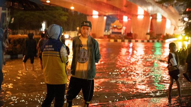 Pantuan detikSumbagsel usai salat Subuh, Ratu Dewa mengecek lokasi banjir di Simpang Polda untuk melihat kedalaman air usai hujan ekstrem sejak tadi malam dan memastikan genangan air tidak membuat kendaraan masyrakat yang melintasi jalan tersebut menjadi mogok.