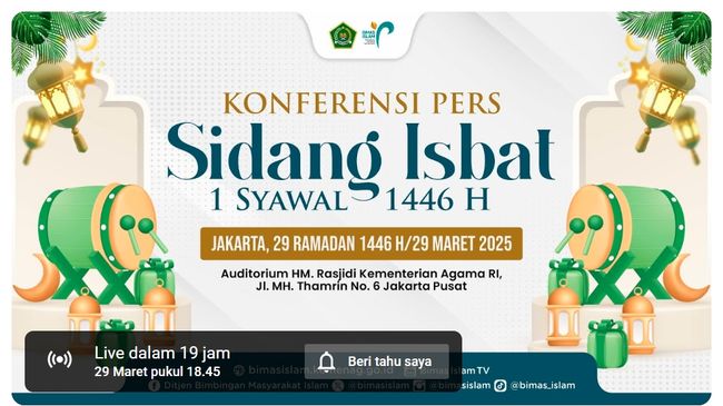 Masyarakat khususnya umat Islam dapat memantau pelaksanaan sidang melalui kanal YouTube Bimas Islam TV. Kemenag akan melakukan konferensi pers untuk mengumumkan penetapan tanggal Lebaran 2025. Adapun link yang bisa diakses sebagai berikut: