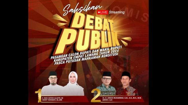 Diketahui, pelaksanaan debat publik antara pasangan calon (paslon) nomor urut 01 Budi Antoni Aljufri-Henny Verawati dan 02 Joncik Muhammad-Arifa'i akan digelar di Hotel Salatin, Kelurahan Bukit Lama, Kecamatan Ilir Barat I, Palembang pada Minggu (13/4/2025) pukul 20.00 WIB.